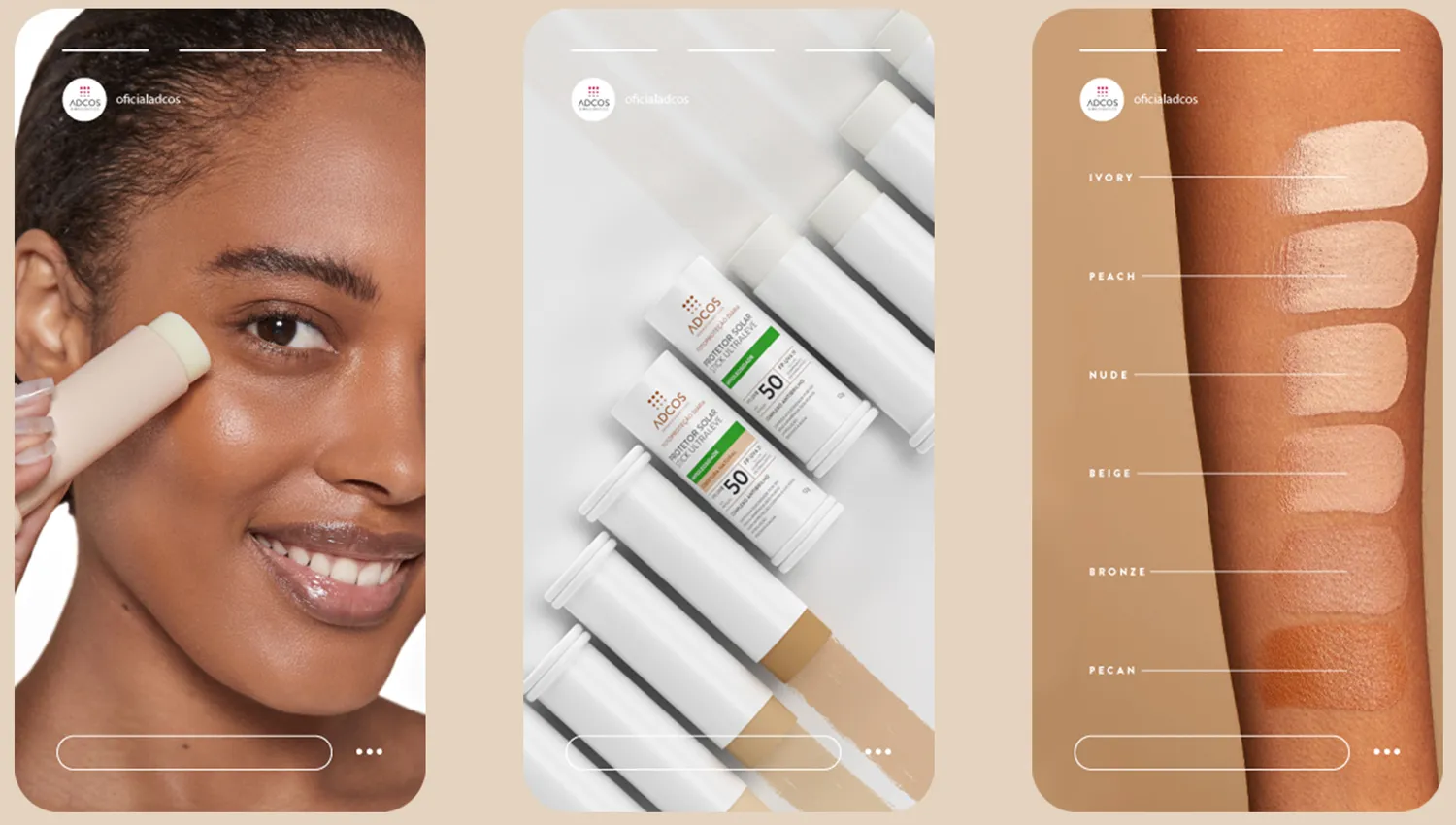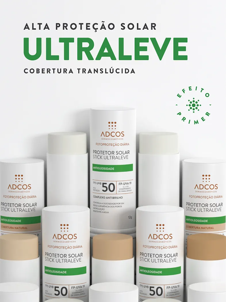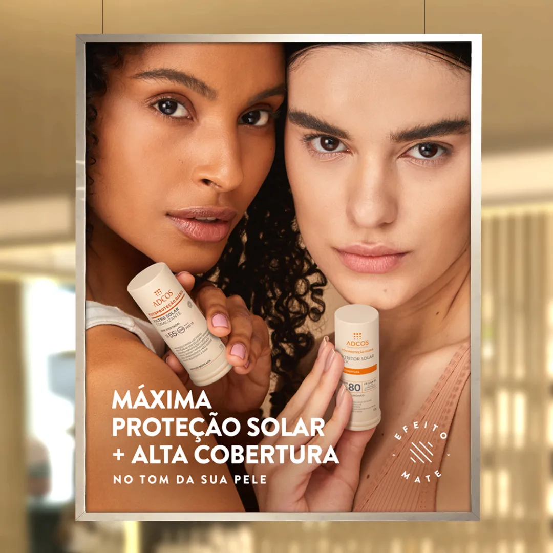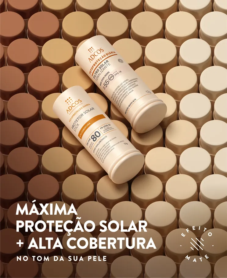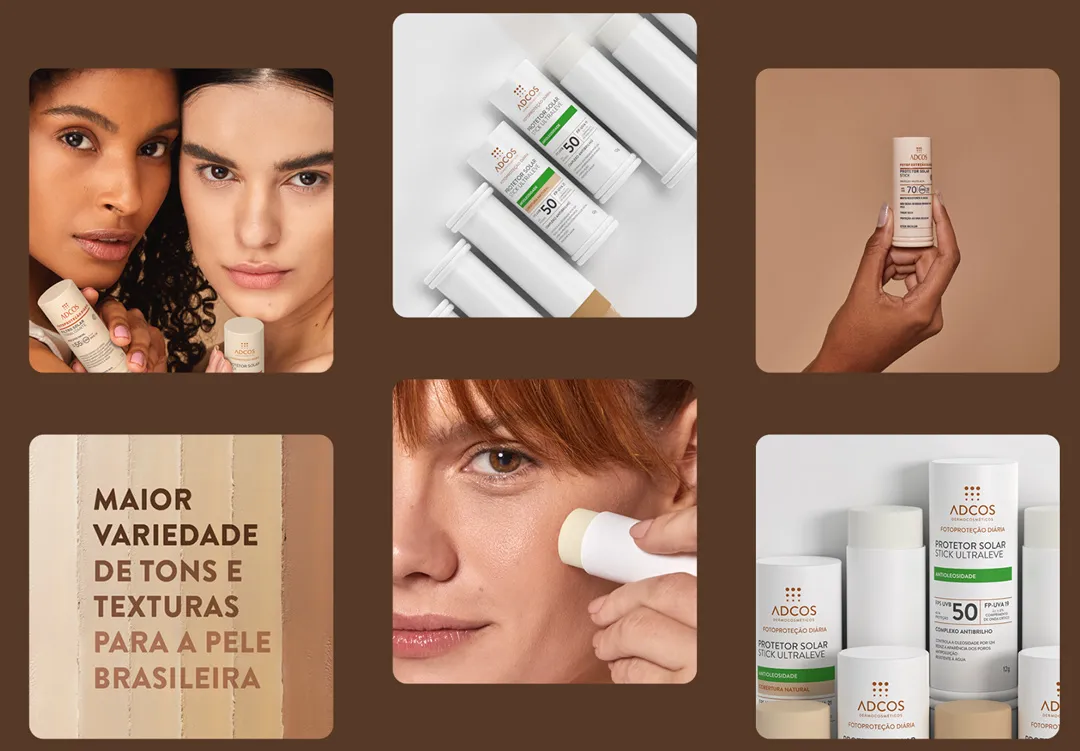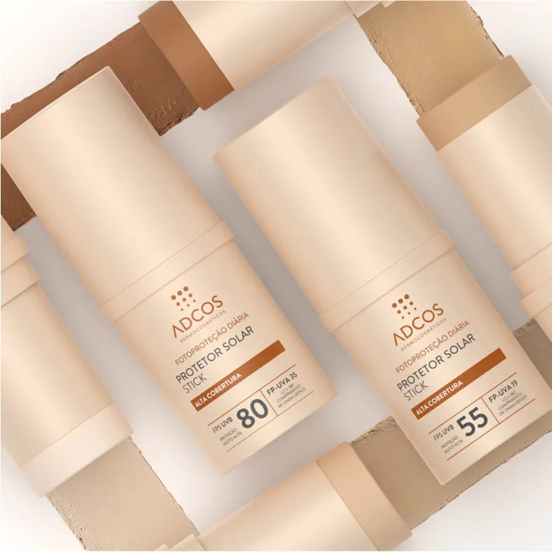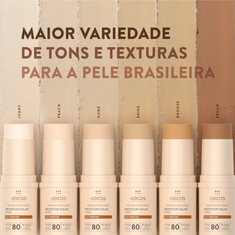 Os protetores solar em stick da Adcos são formulados com poderosos ativos, que garantem alta cobertura e possuem 6 diferentes tonalidades, criadas exclusivamente para a diversidade da pele brasileira.