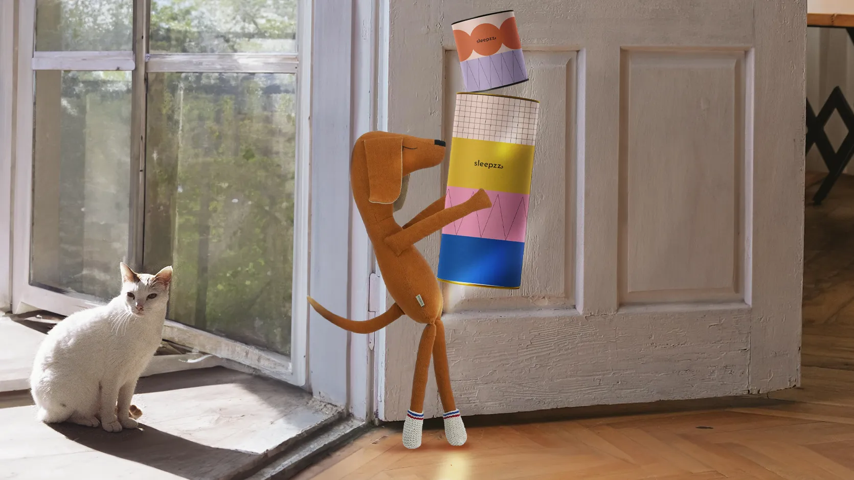 Com uma abertura central, estrategicamente posicionada, a embalagem surpreende ao revelar um Sleepzz aguardando carinho com suas patinhas para cima, criando uma adorável primeira impressão.