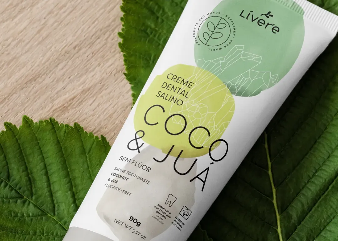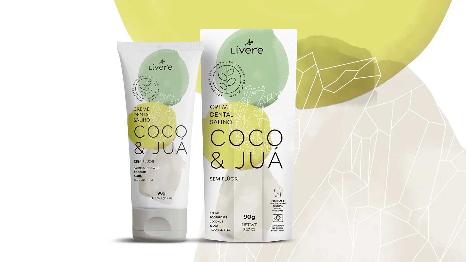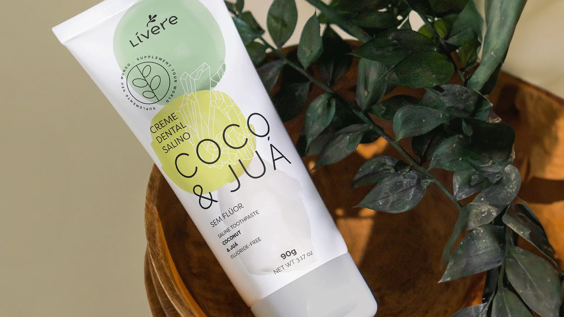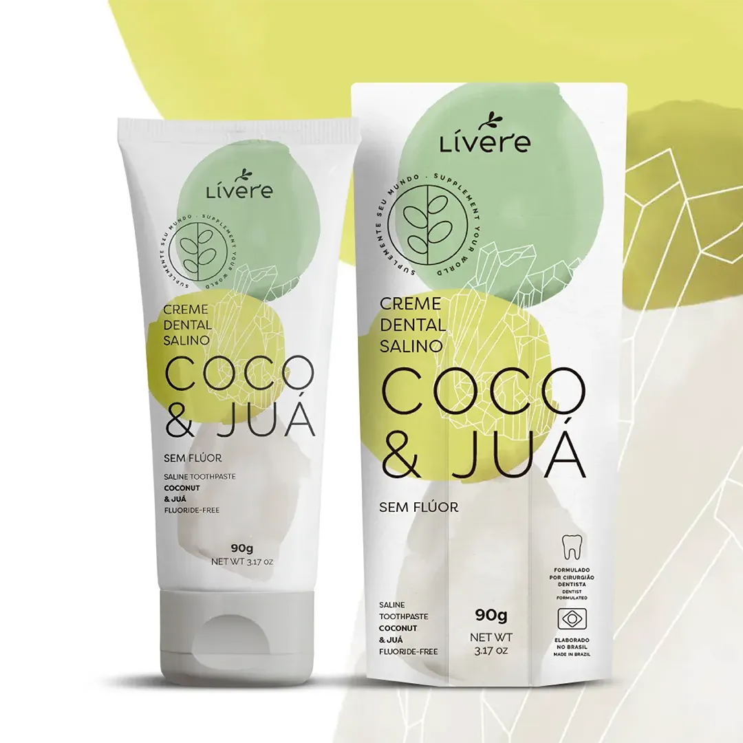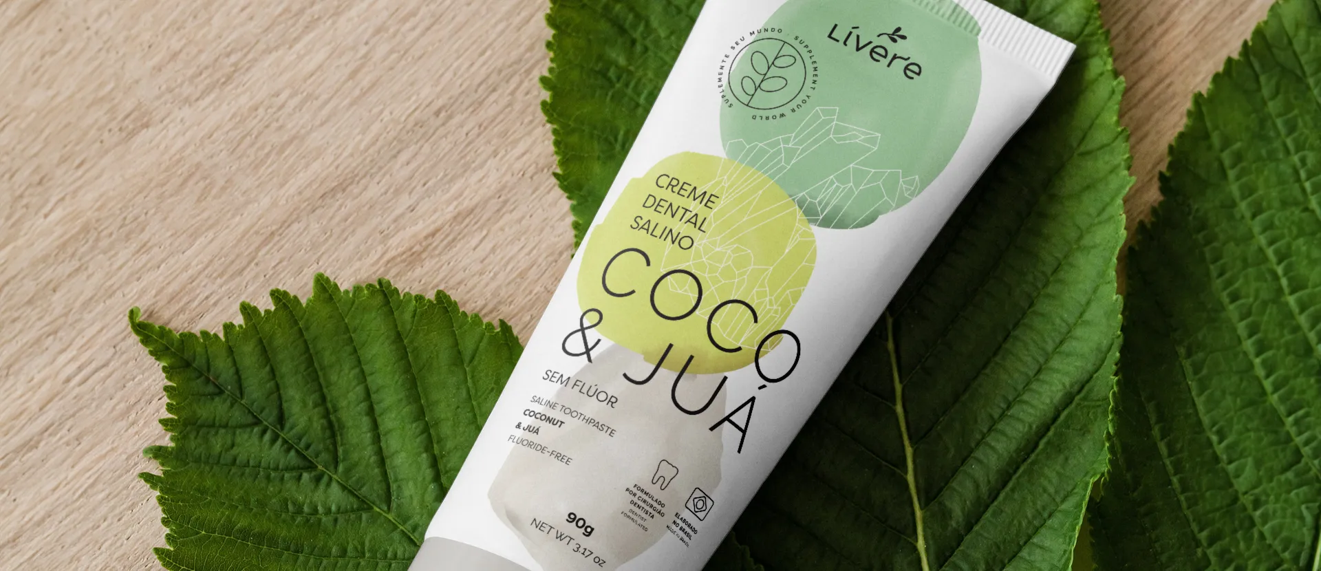 A embalagem do Creme Dental Salino Coco e Juá da Lívere buscamos refletir o compromisso da marca em equilibrar o melhor da natureza com os avanços científicos.