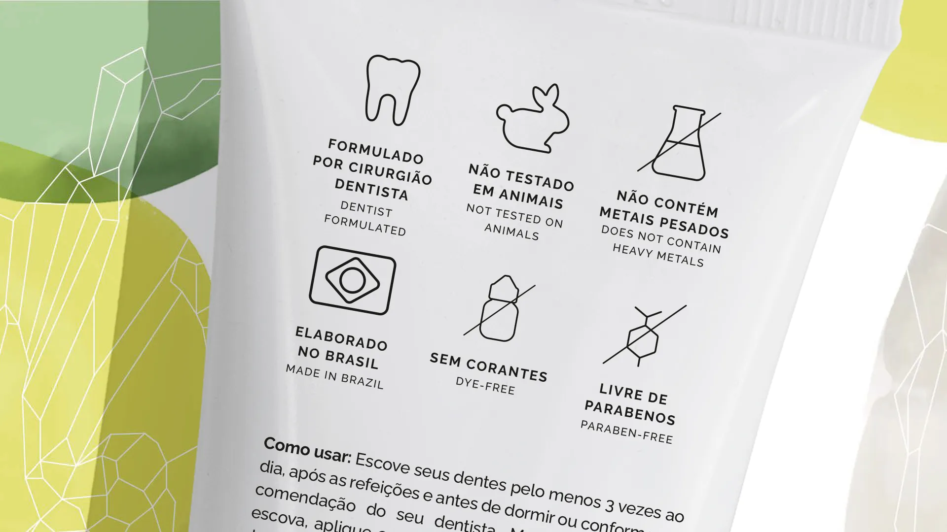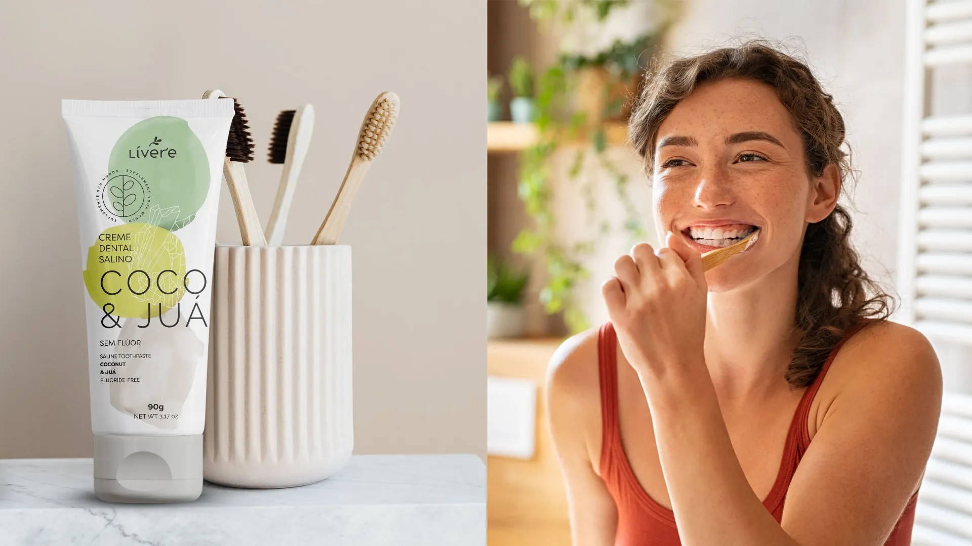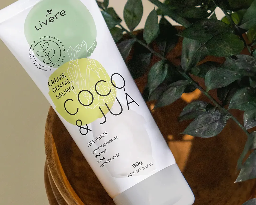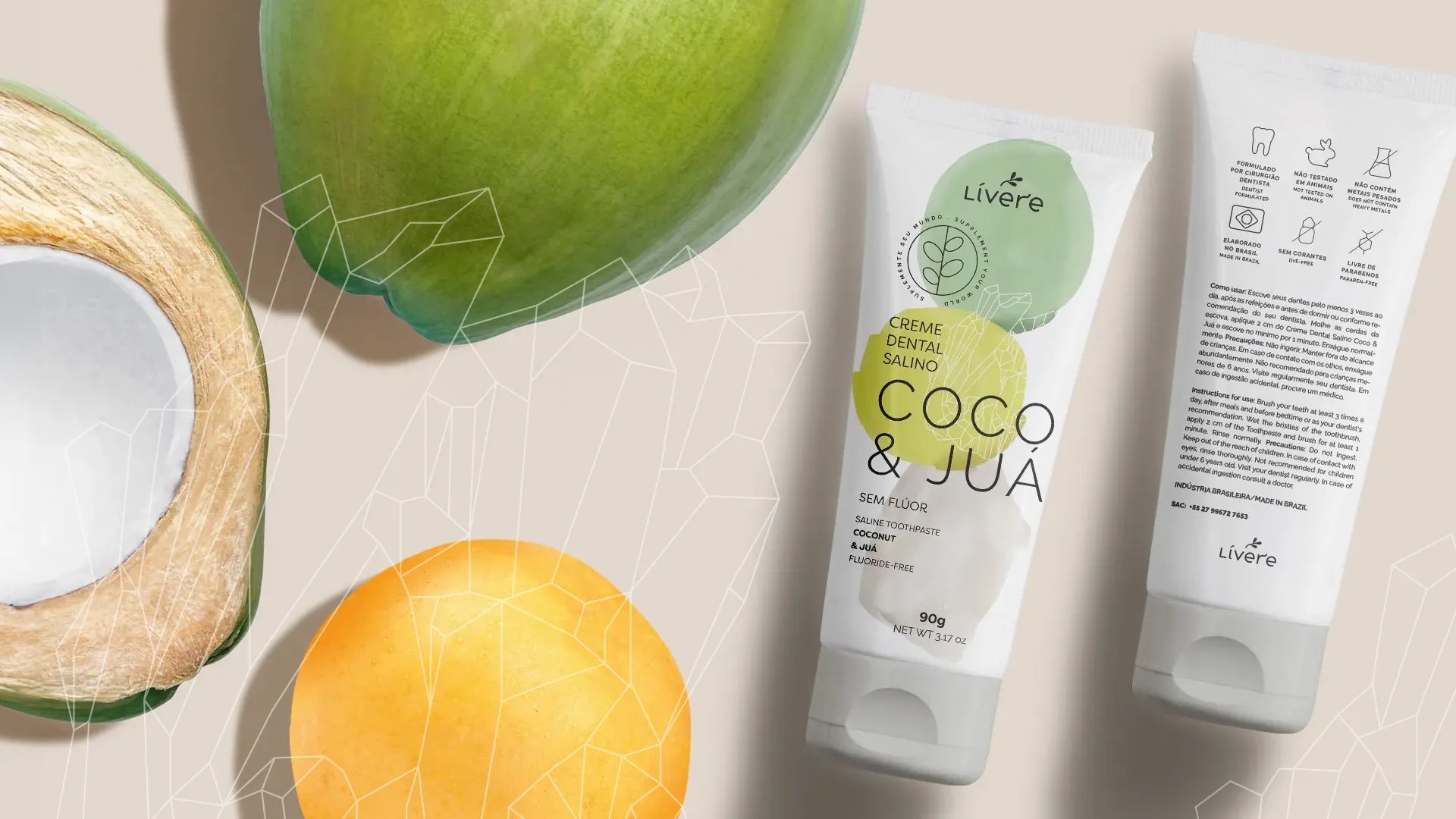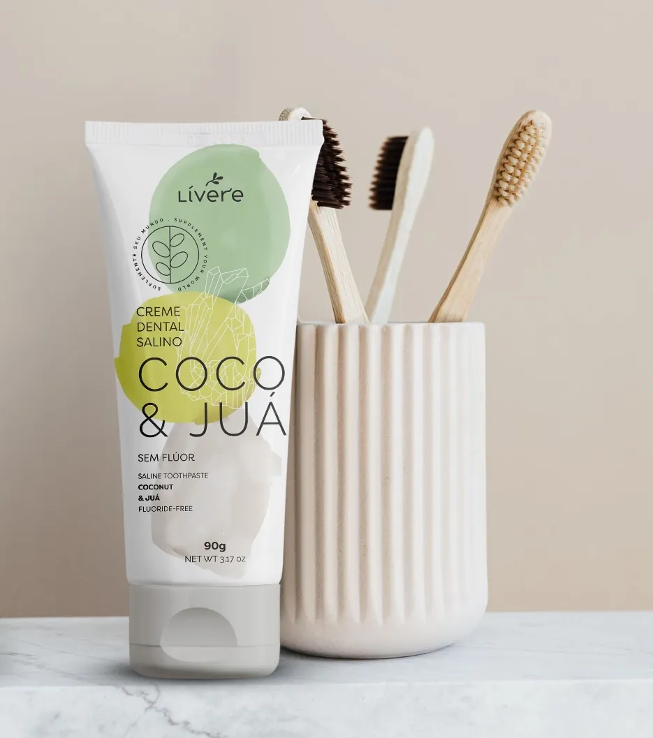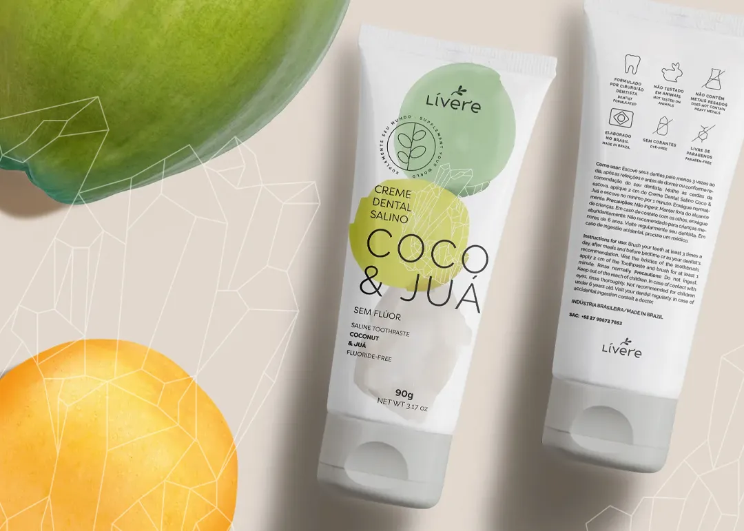A embalagem do Creme Dental Salino Coco e Juá da Lívere buscamos refletir o compromisso da marca em equilibrar o melhor da natureza com os avanços científicos.